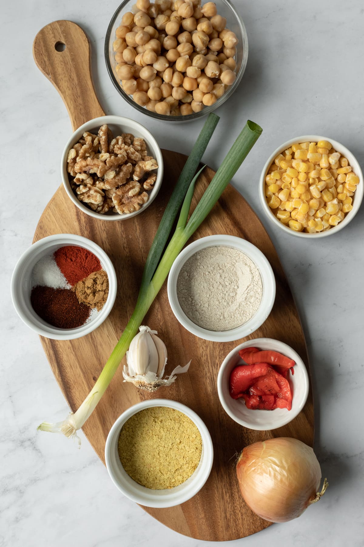 --> Stop een paar keer om de consistentie te controleren. Je wilt van het mengsel geen puree maken. Een paar grotere stukken kikkererwten en walnoot zijn oké. Vouw de maïs en de groene ui erdoor.